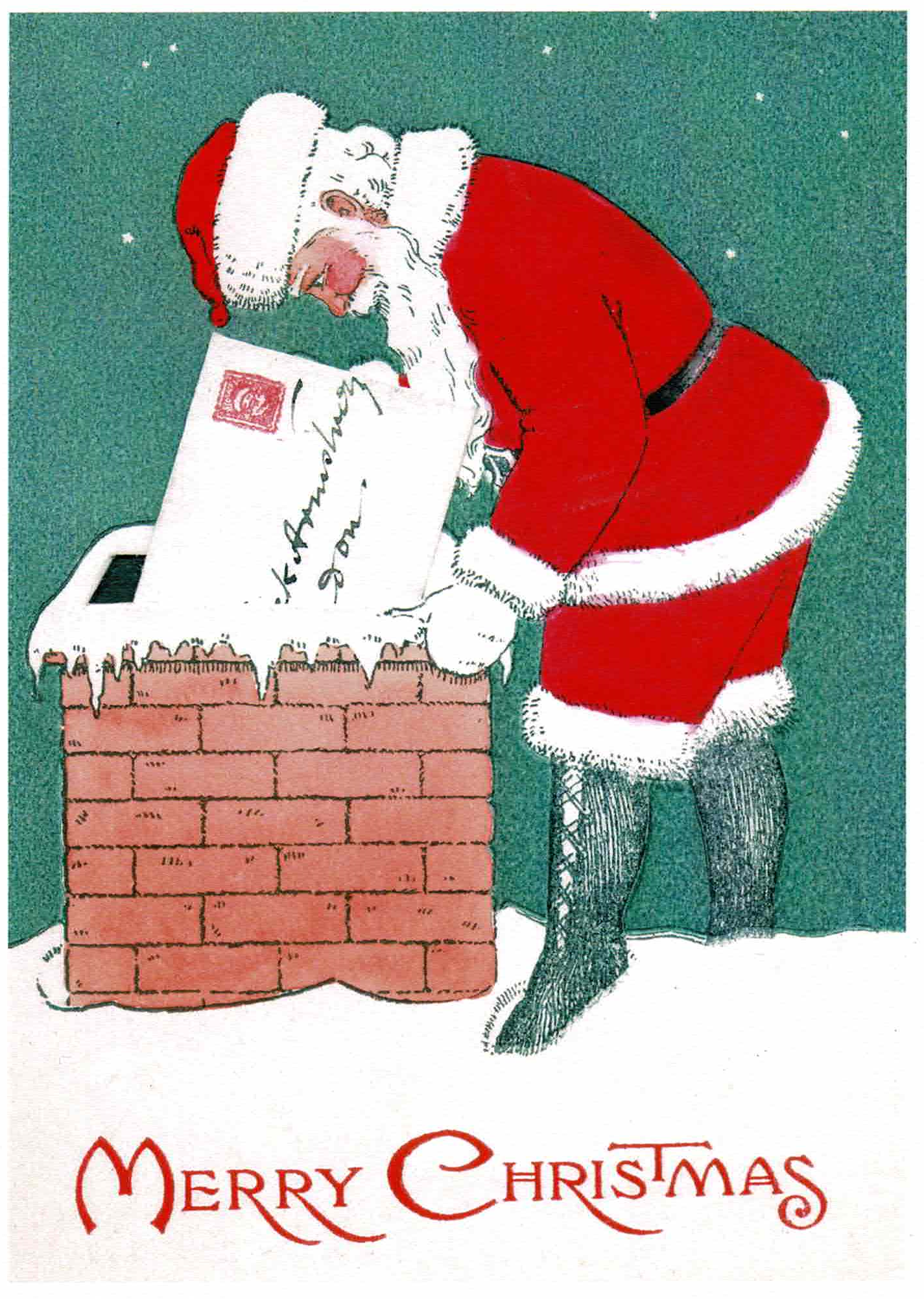 A small, humorous Christmas card with Santa delivery presents through the chimney.